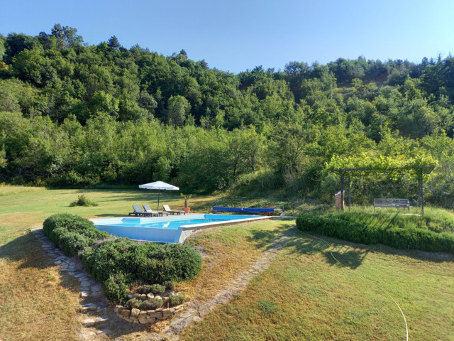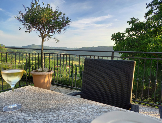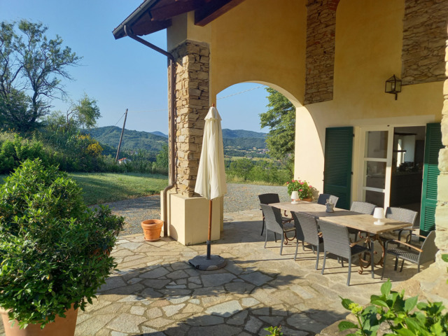Het huis heeft diverse terrassen waaronder een deels overdekt terras met fantastisch uitzicht op het dal en het dorp Cartosio.